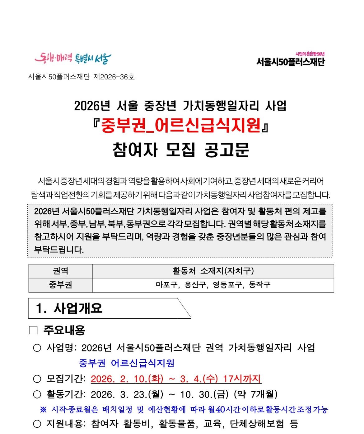 서울시50플러스재단 중부권 어르신급식지원(1차 공동모집)