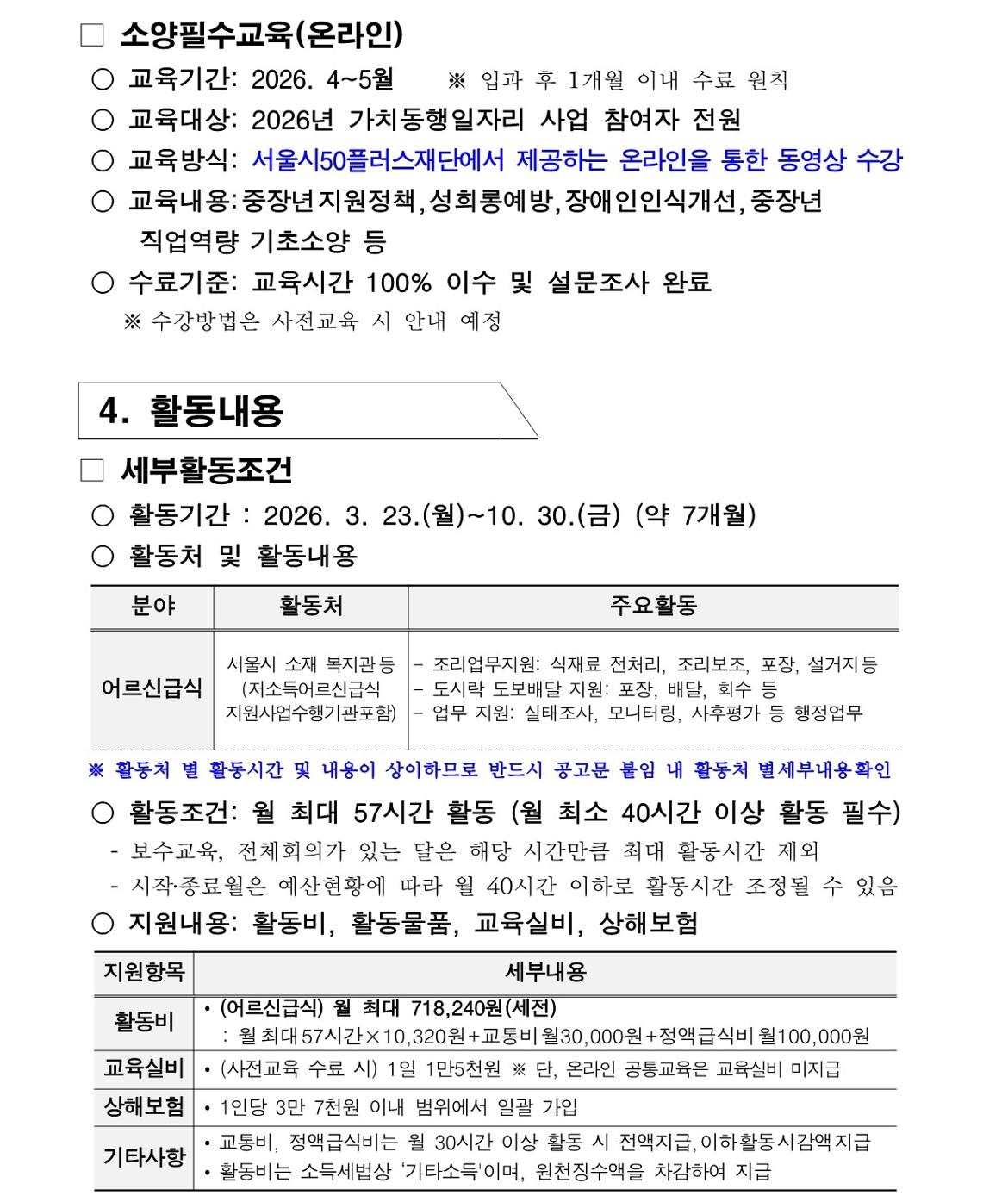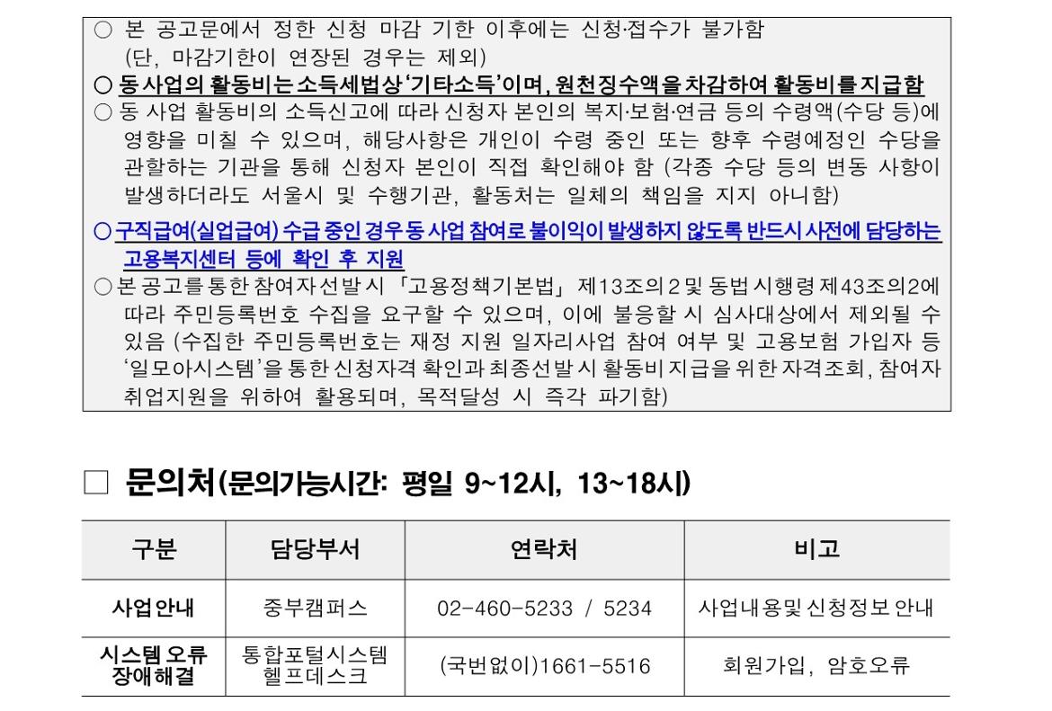 • 40세 이상(차상위 계층도 동일)인 자 중 주민등록상 서울시 거주자 또는 사업장 주소지가 서울시인 사업자등록증 상 대표자 • 월 활동시간(57시간) 중 70%(40시간)이상 활동이 가능한 자 • 모집공고 최종합격 후 참여자 사전교육 수료(90% 이상), 소양필수교육 수료(100%) 가능한 자 • 모집공고 마감일 전까지 재단에서 운영하는 가치동행일자리 기초교육 수료한 자