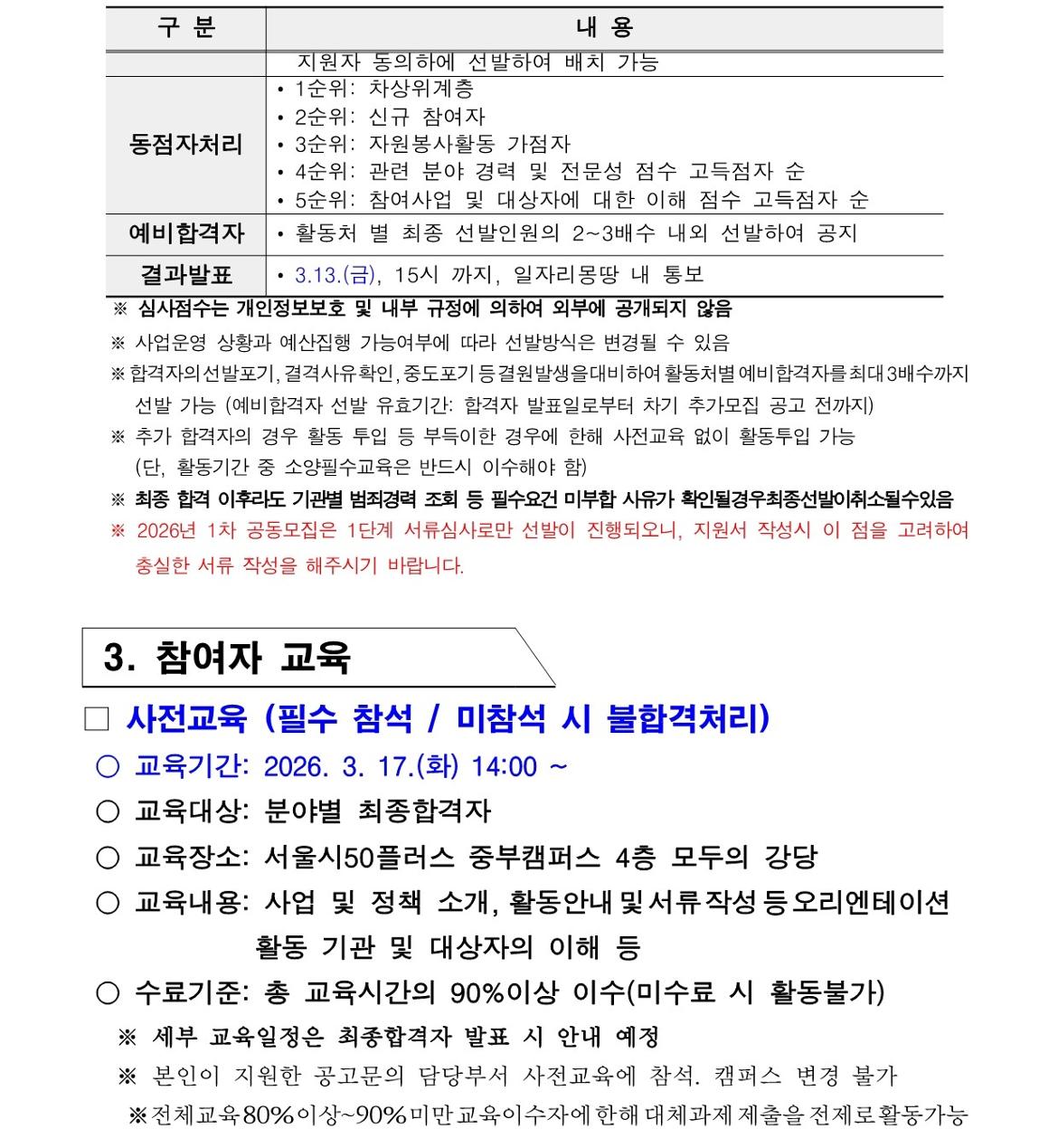 3. 참여자 선발심사는 선호활동처 1, 2순위를 기준으로 진행, 3순위 활동처는 참고용