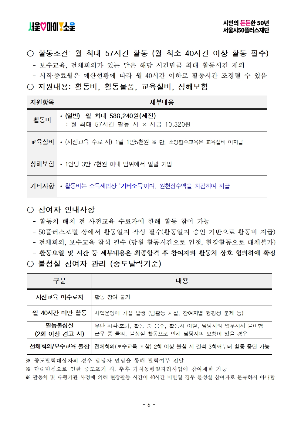• 40세 이상(1986.12.31.이전 출생자, 차상위 계층도 동일)인 자 중 주민등록상 서울시 거주자 또는 사업장 주소지가 서울시인 사업자등록증 상 대표자 • 월 활동시간(57시간) 중 70%(40시간)이상 활동이 가능한 자 • 모집공고 최종합격 후 참여자 사전교육 수료(90% 이상), 소양필수교육 수료(100%) 가능한 자 • 모집공고 마감일 전까지 재단에서 운영하는 가치동행일자리 기초교육 수료한 자