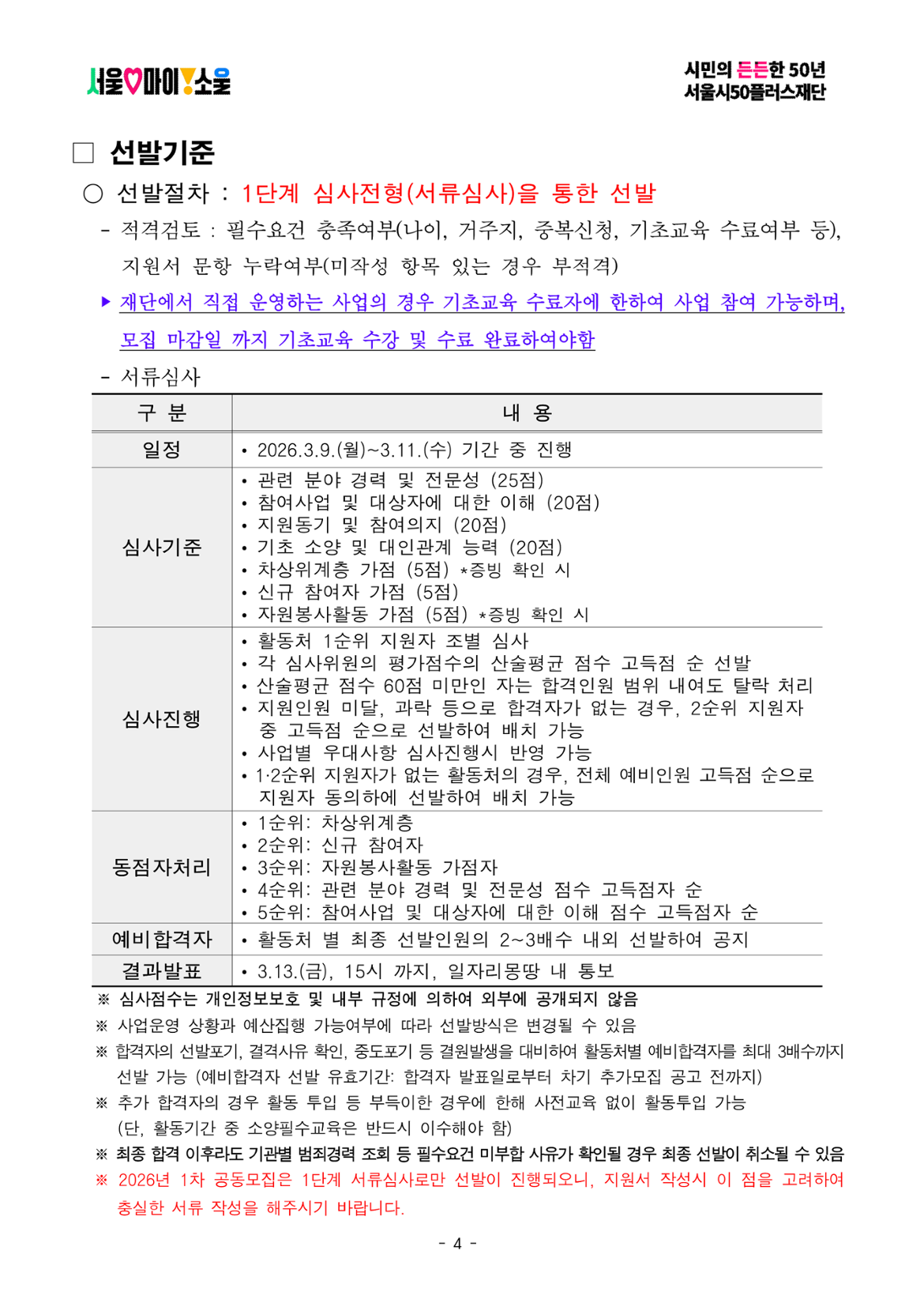 1) 신규 사업참여자 2) 활동처 자원봉사자: 신청자가 지원한 1순위 활동처에서 2025년 11월 1일~2026년 3월 4일 사이 2개월 이상 자원봉사 이력이 있는 자 3) 차상위계층(기준 중위소득 50%이하)인 자 ※ 1~3번 사항의 우대조건은 심사 시 우대사항이며, 필수요건은 아님 ※ 2~3번 사항은 온라인 신청 시 증빙서류 첨부 필수, 증빙서류 미첨부 시 가점 미부여