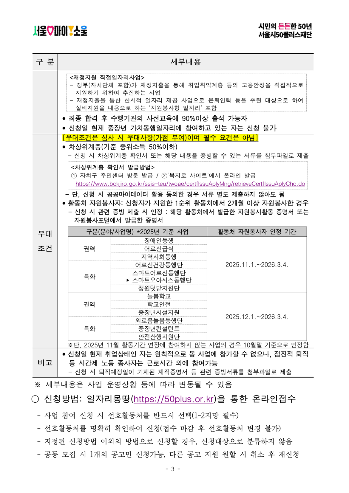 1. 신규 사업참여자 2. 활동처 자원봉사자: 신청자가 지원한 1순위 활동처에서 2025년 11월 1일~2026년 3월 4일 사이 2개월 이상 자원봉사 이력이 있는 자 3. 차상위계층(기준 중위소득 50%이하)인 자 ※ 1~3번 사항의 우대조건은 심사 시 우대사항이며, 필수요건은 아님 ※ 2~3번 사항은 온라인 신청 시 증빙서류 첨부 필수, 증빙서류 미첨부 시 가점 미부여