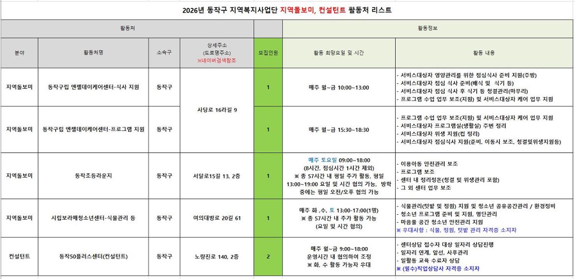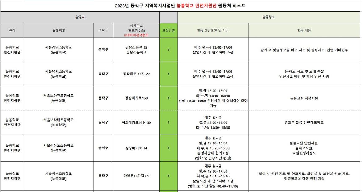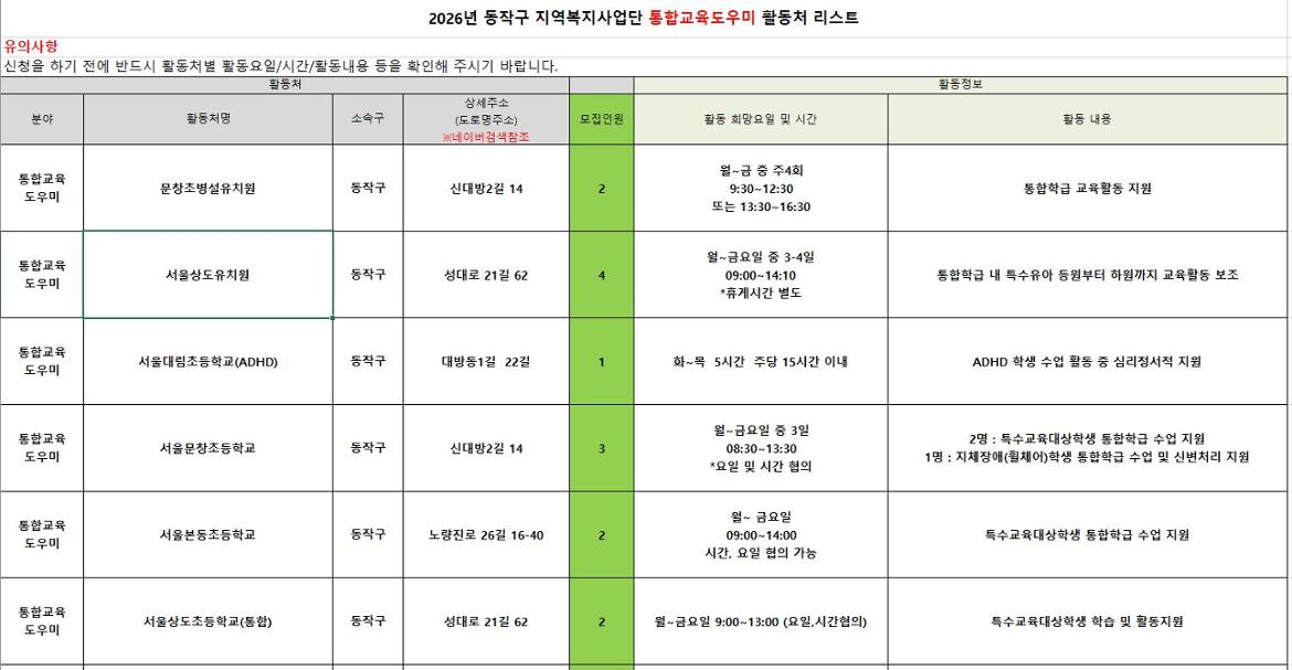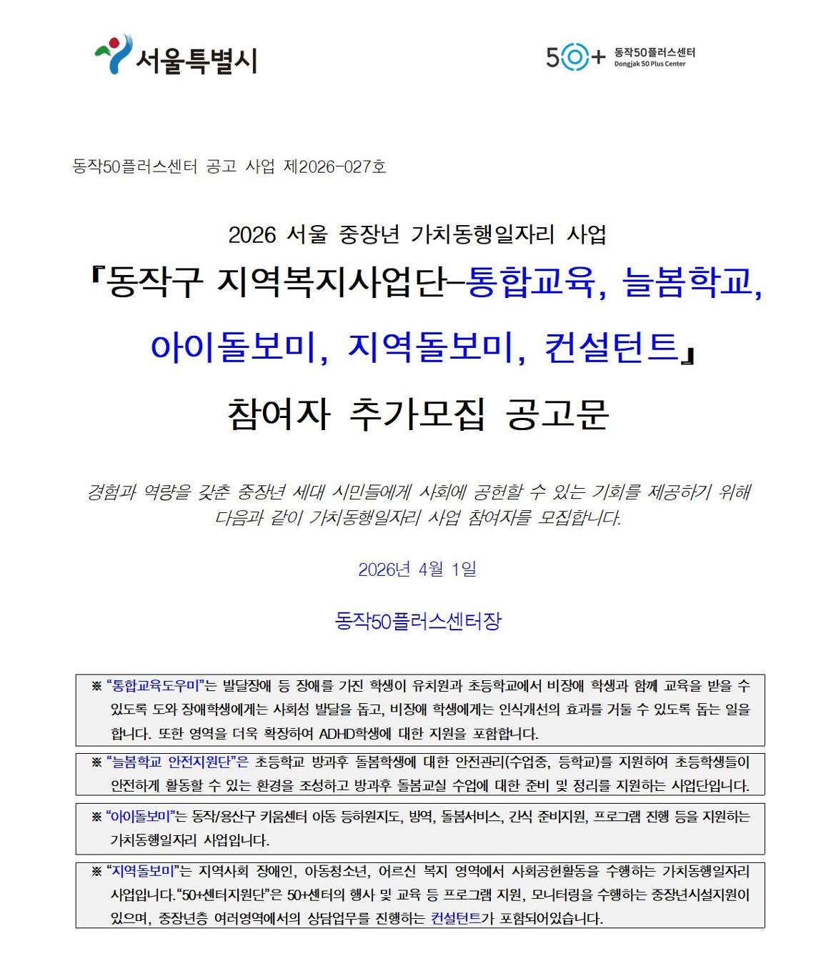 동작구 지역복지사업단 - 통합교육, 늘봄학교, 아이돌보미, 지역돌보미, 컨설턴트 참여자 1차 추가모집공고마감 D-12