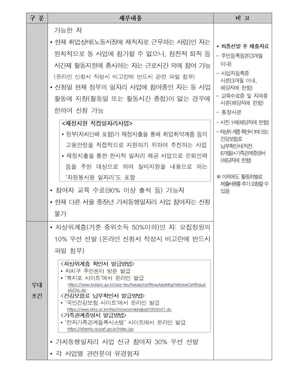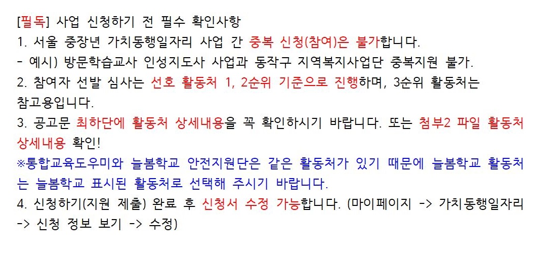 차상위계층(기준 중위소득 50%이하) : 모집정원의 10% 우선 선발 가치동행일자리사업 신규 참여자 : 모집정원의 30% 우선 선발 자원봉사활동 증명서 제출자 : 지원하는 활동처에 대한 자원봉사 증명서만 인정됨 각 사업별 관련분야 유경험자