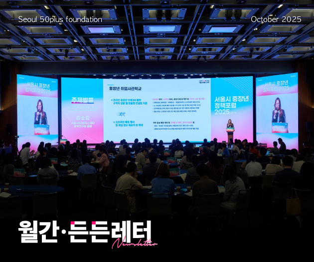 시민의 든든한 50년, 서울시50플러스가 함께합니다. 안녕하세요! 서울시50플러스재단의 10월 소식을 전해드립니다. 지난 9월에는 채용박람회와 정책포럼 등 주요 행사를 성공적으로 마무리하며, 중장년 세대의 가능성과 연결의 장을 넓힐 수 있는 의미 있는 시간을 가졌습니다. 이제는 그 성과를 바탕으로 한 걸음 더 나아갈 준비를 할 때입니다!