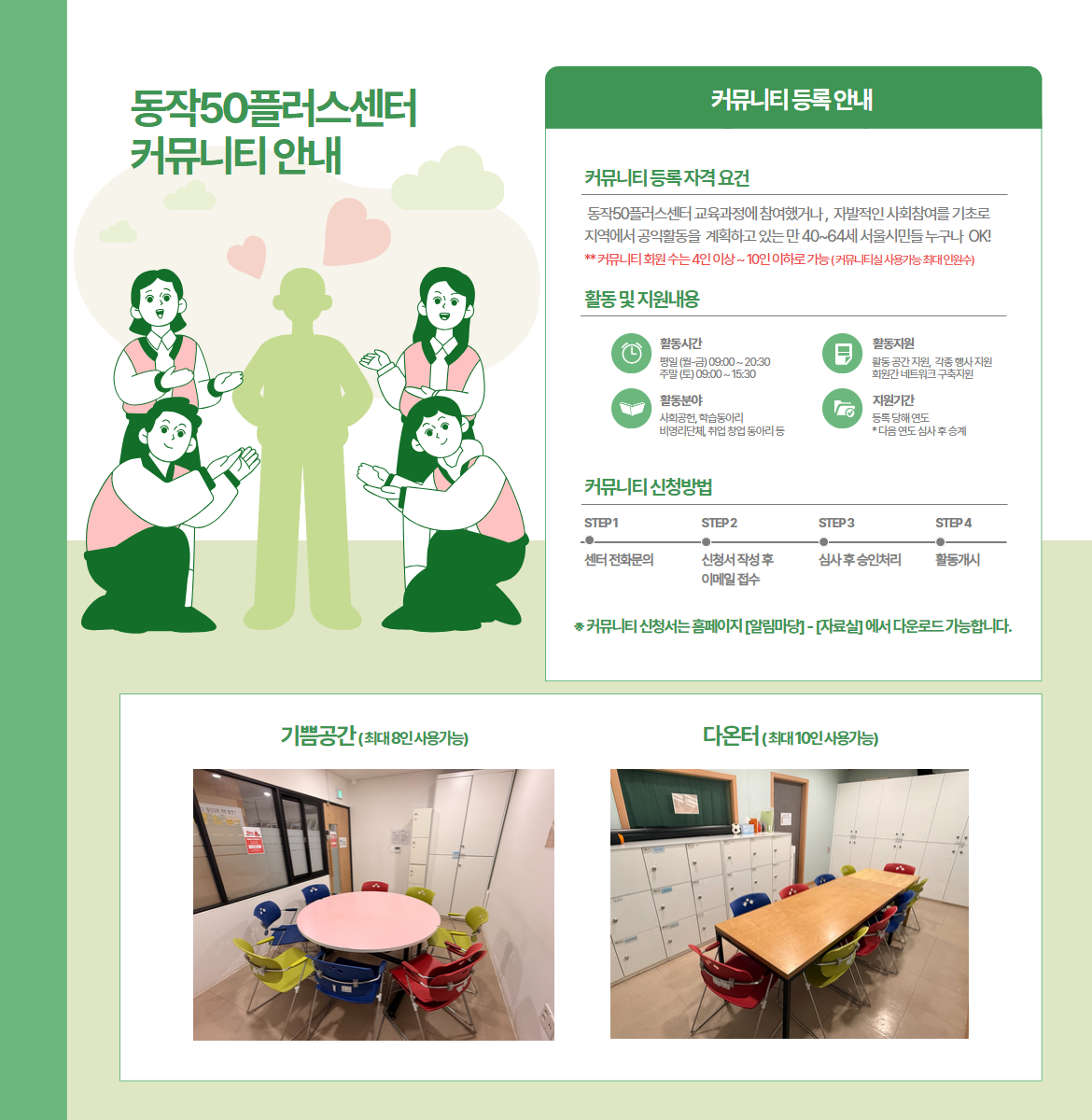 동작50플러스센터 (06922)서울특별시 동작구 노량진로 140 메가스터디타워 2층 사업자등록번호 : 190-82-00537 / 대표자 : 김성현