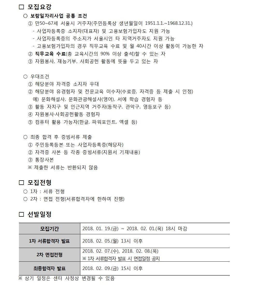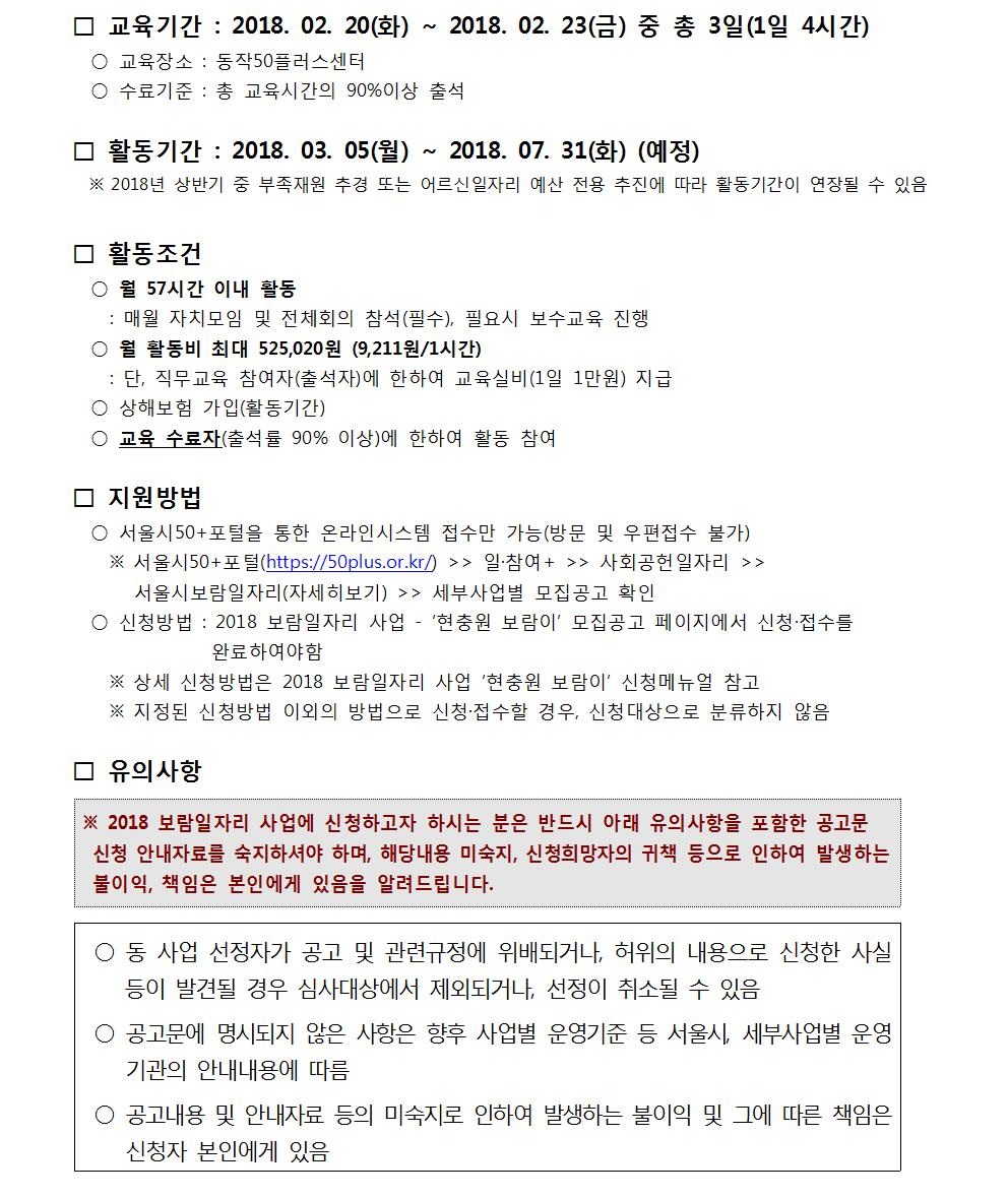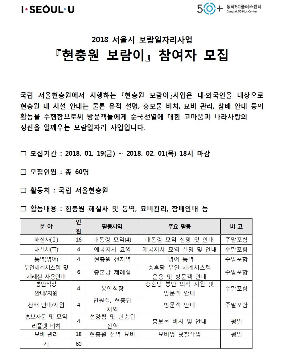 서울시 동작센터 | 2018년 보람일자리사업 '현충원 보람이' 참여자 모집 공고