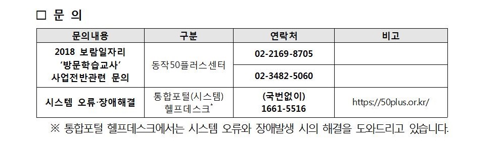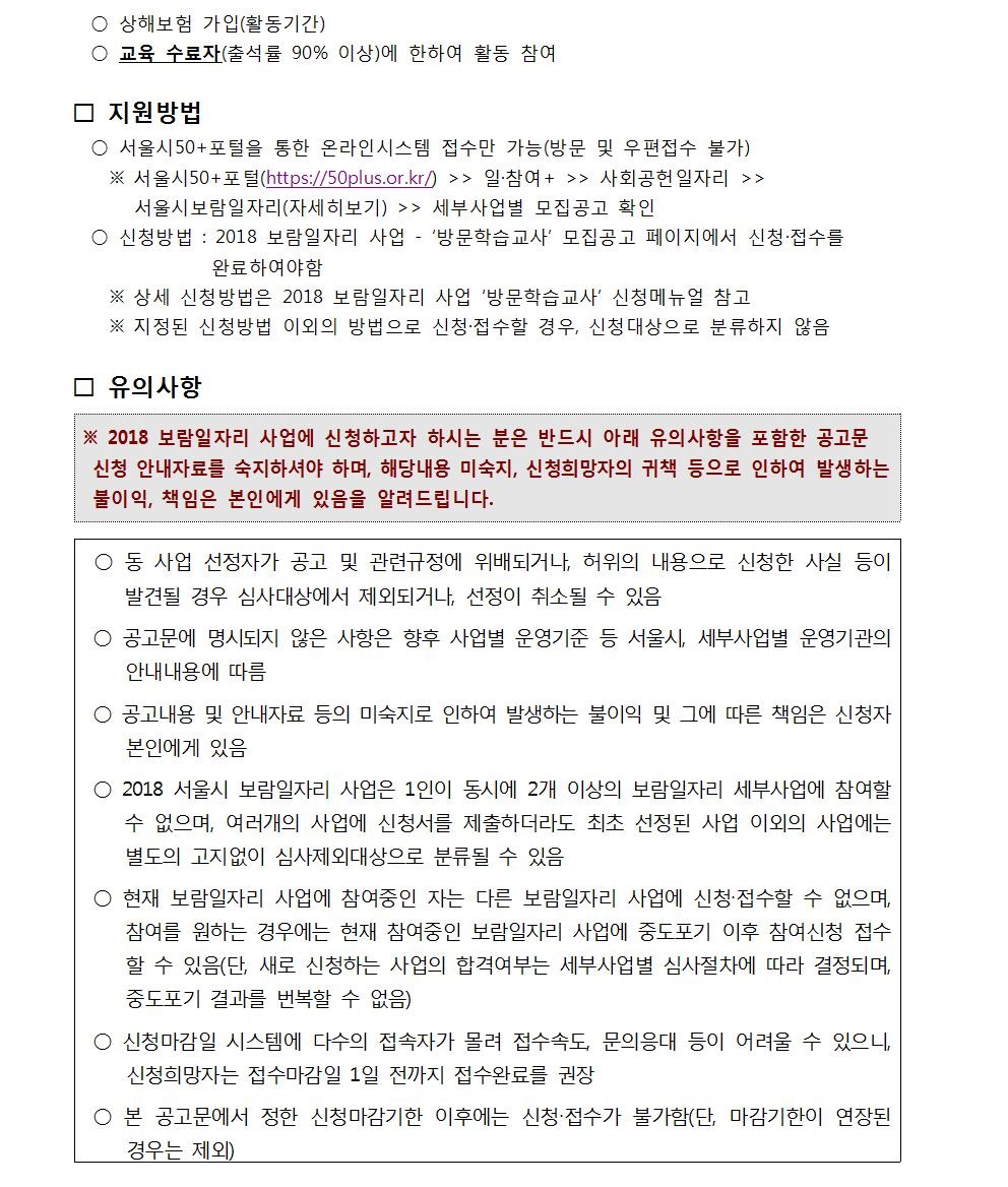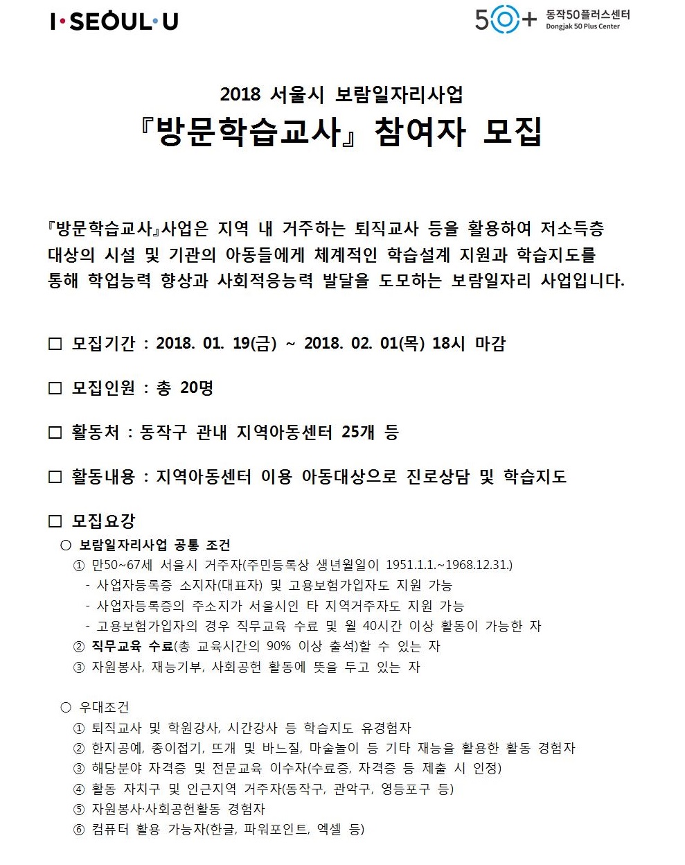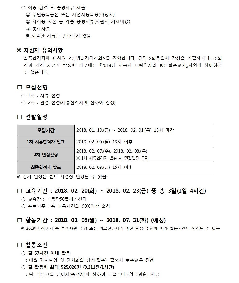 서울시 동작센터 | 2018년 보람일자리사업 '방문학습교사' 참여자 모집 공고