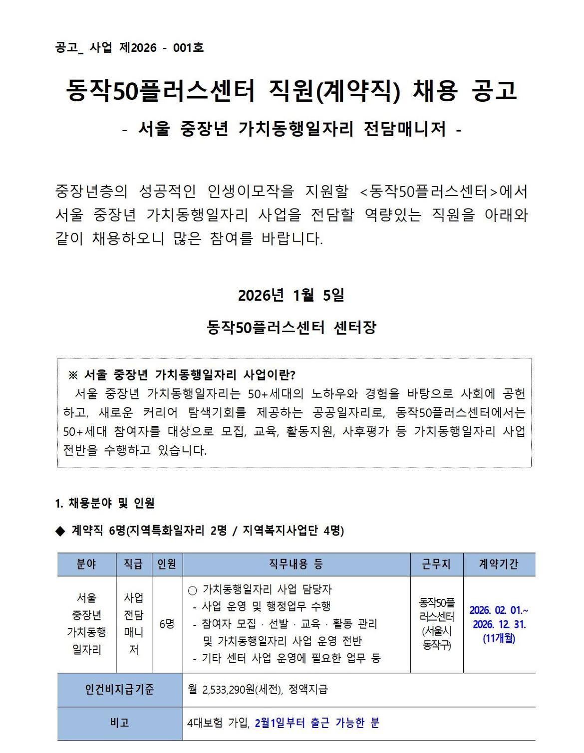 서울시 동작센터 | 동작50플러스센터 직원(계약직) 채용 공고- 서울 중장년 가치동행일자리 전담매니저