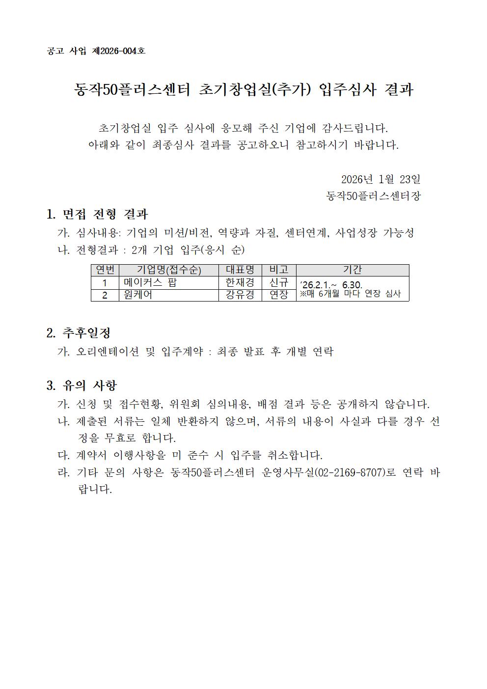 동작50플러스센터 초기창업실(추가) 입주심사 결과