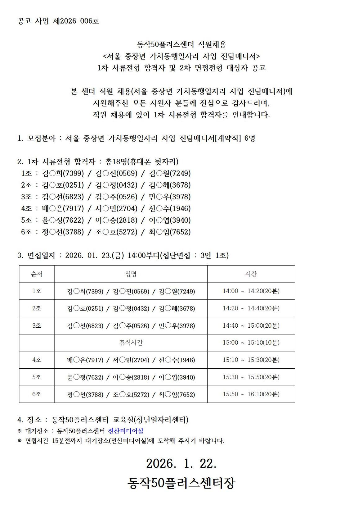 서울시 동작센터 | 서울 중장년 가치동행일자리 전담매니저 1차 서류전형 합격자 및 2차 면접전형 대상자 공고