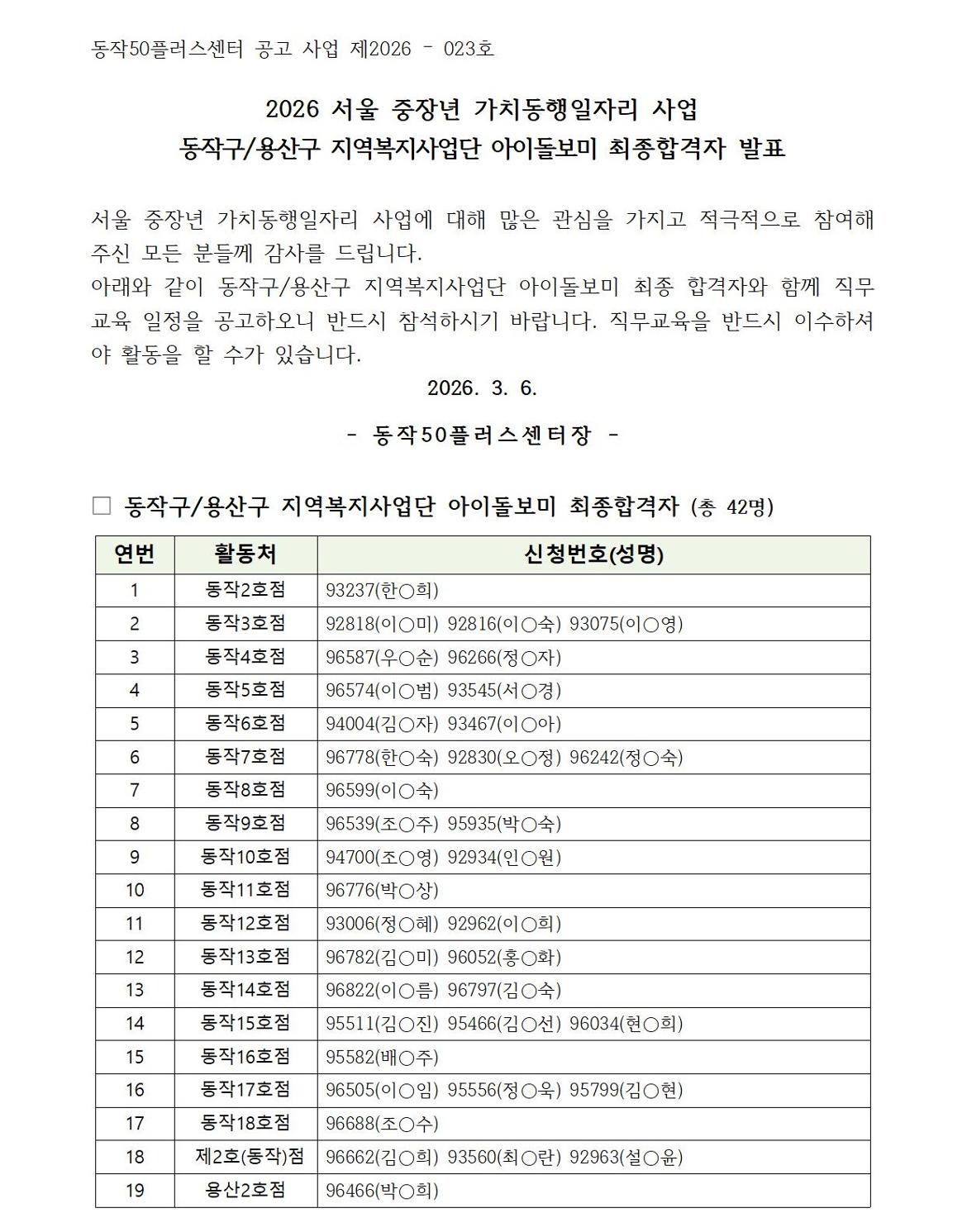 서울시 동작센터 | 2026 서울 중장년 가치동행일자리 사업 - 동작구/용산구 지역복지사업단 아이돌보미 최종합격자 발표 및 사전직무교육 안내