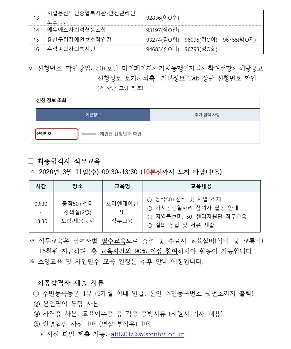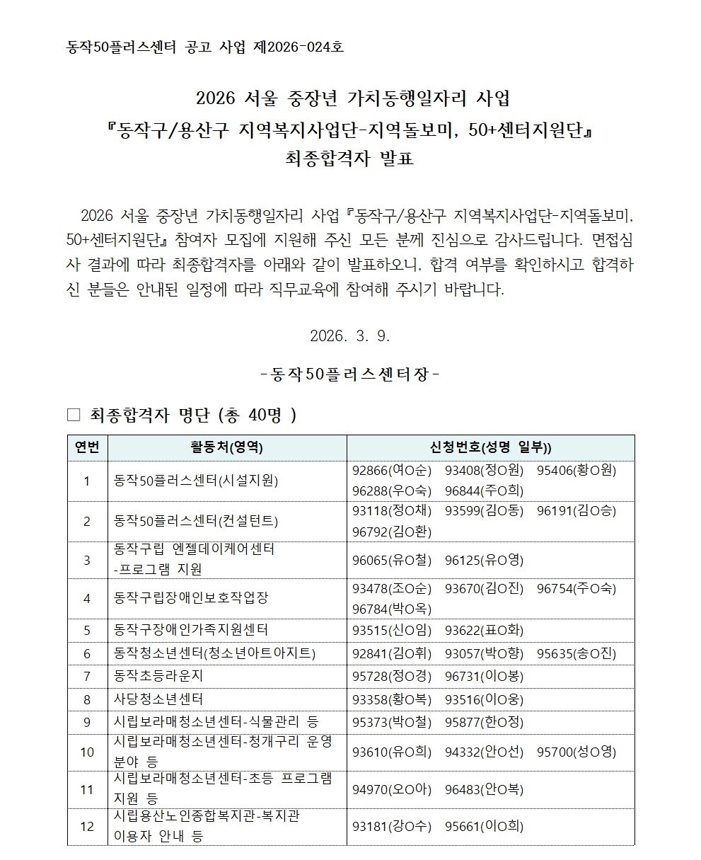 서울시 동작센터 | 2026 서울 중장년 가치동행일자리 사업-지역돌보미, 50+센터지원단 최종합격자 발표 및 사전직무교육 안내