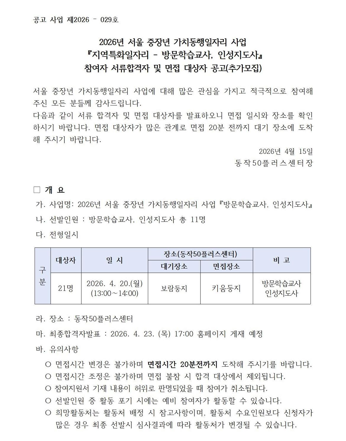 서울시 동작센터 | 2026 서울 중장년 가치동행일자리 지역특화일자리-방문학습교사 인성지도사 참여자 추가모집 서류심사 합격자 및 면접 대상자 공고