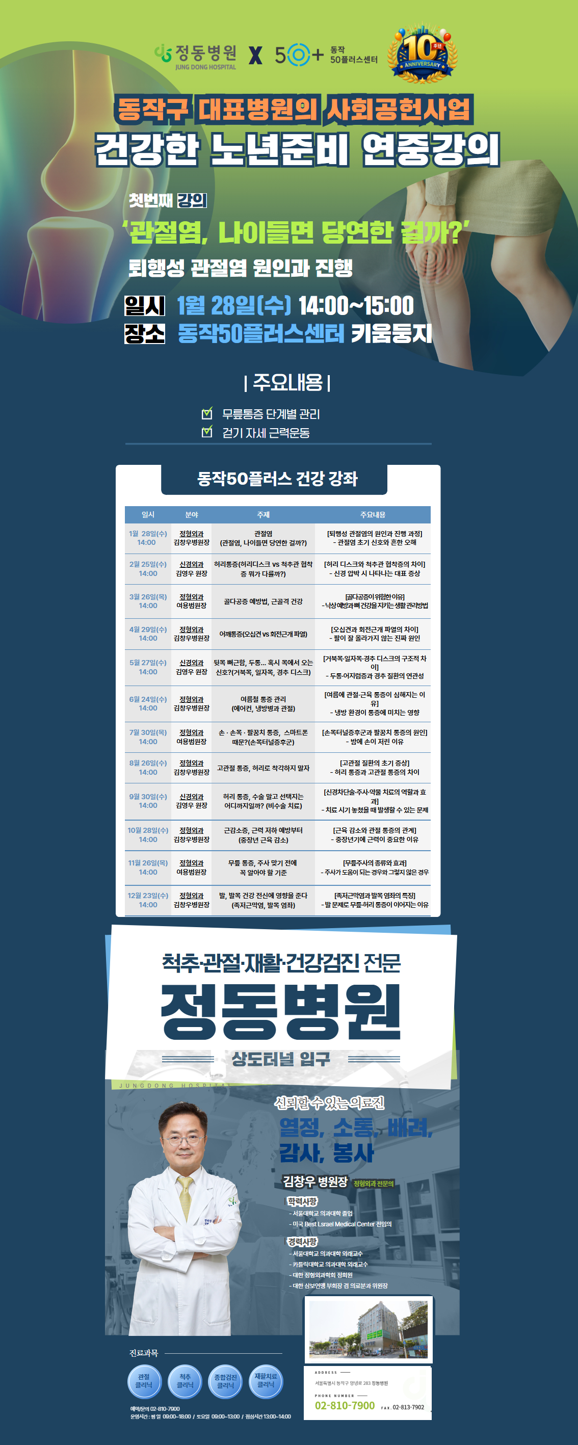 (1 회차) 2026.01.28(14:00 ~ 15:00) 3. 키움둥지 정동병원 정형외과 전문의 주제: 관절염! 관절염 나이들면 당연한 걸까?