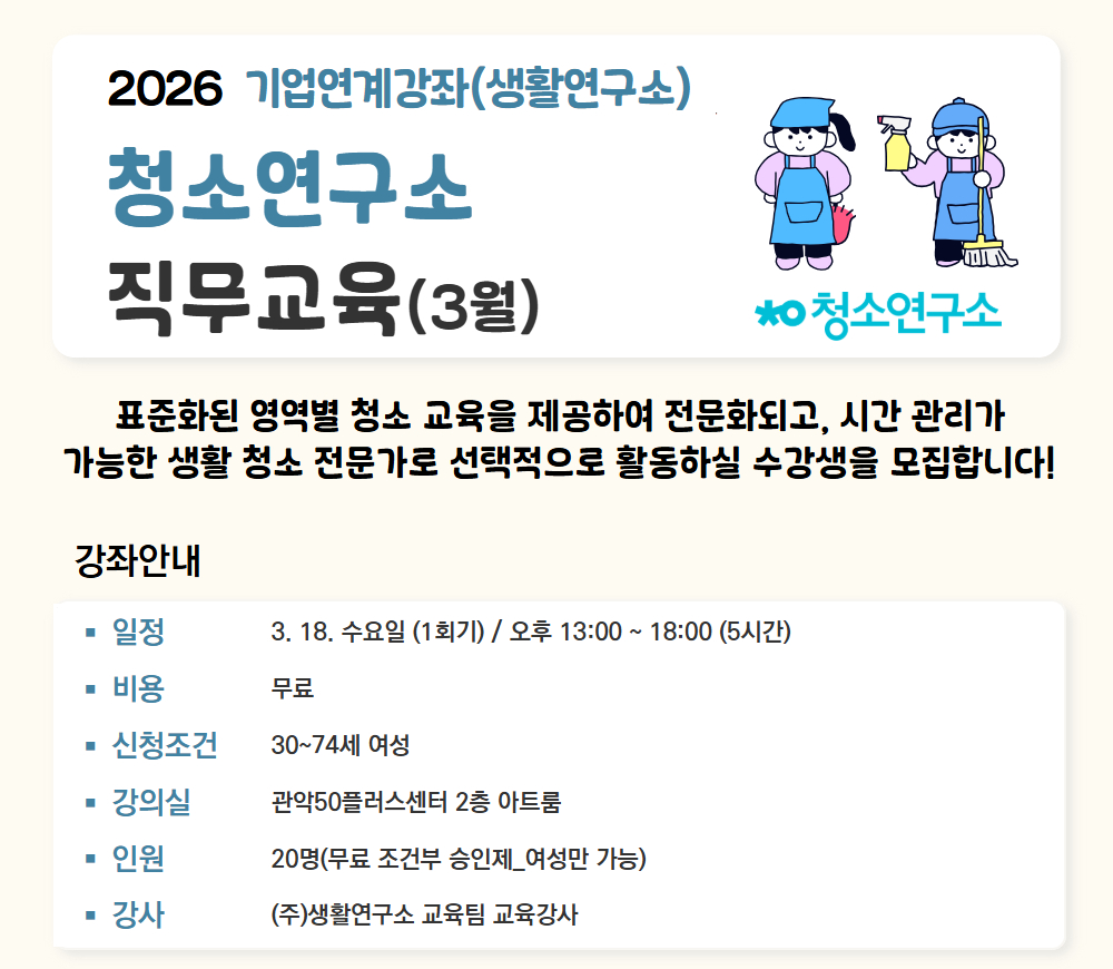 [관악](주)생활연구소 : 청소연구소 플랫폼 직무교육 (3월 과정)마감 D-13