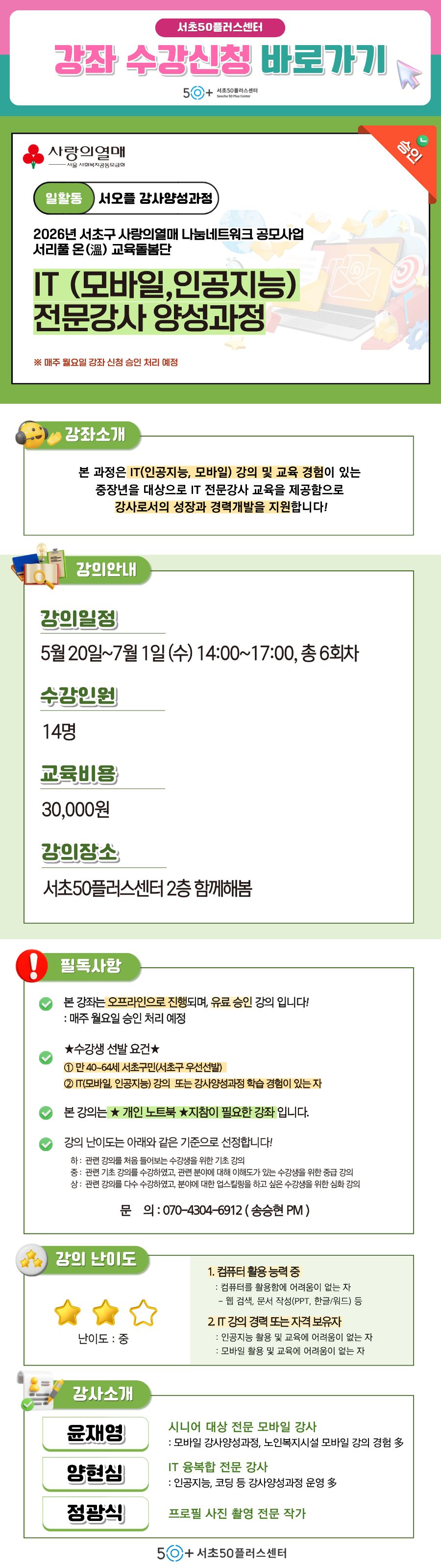 [서초][서초구 사랑의열매 나눔네트워크 '서리풀 온(溫) 교육돌봄단'] IT (모바일,인공지능) 전문강사양성과정마감 D-25