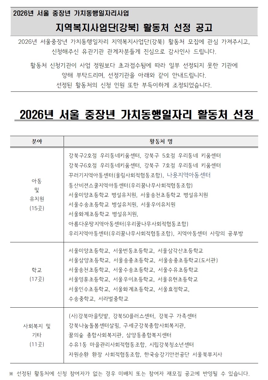서울시 강북센터 | 2026년 가치동행일자리 지역복지사업단(강북) 활동처 선정 공고