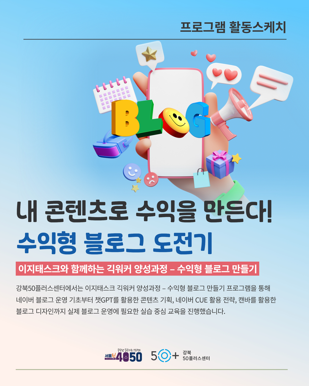 이번 과정은 네이버 블로그 운영 기초부터 콘텐츠 기획, 디자인, 상위 노출 전략까지