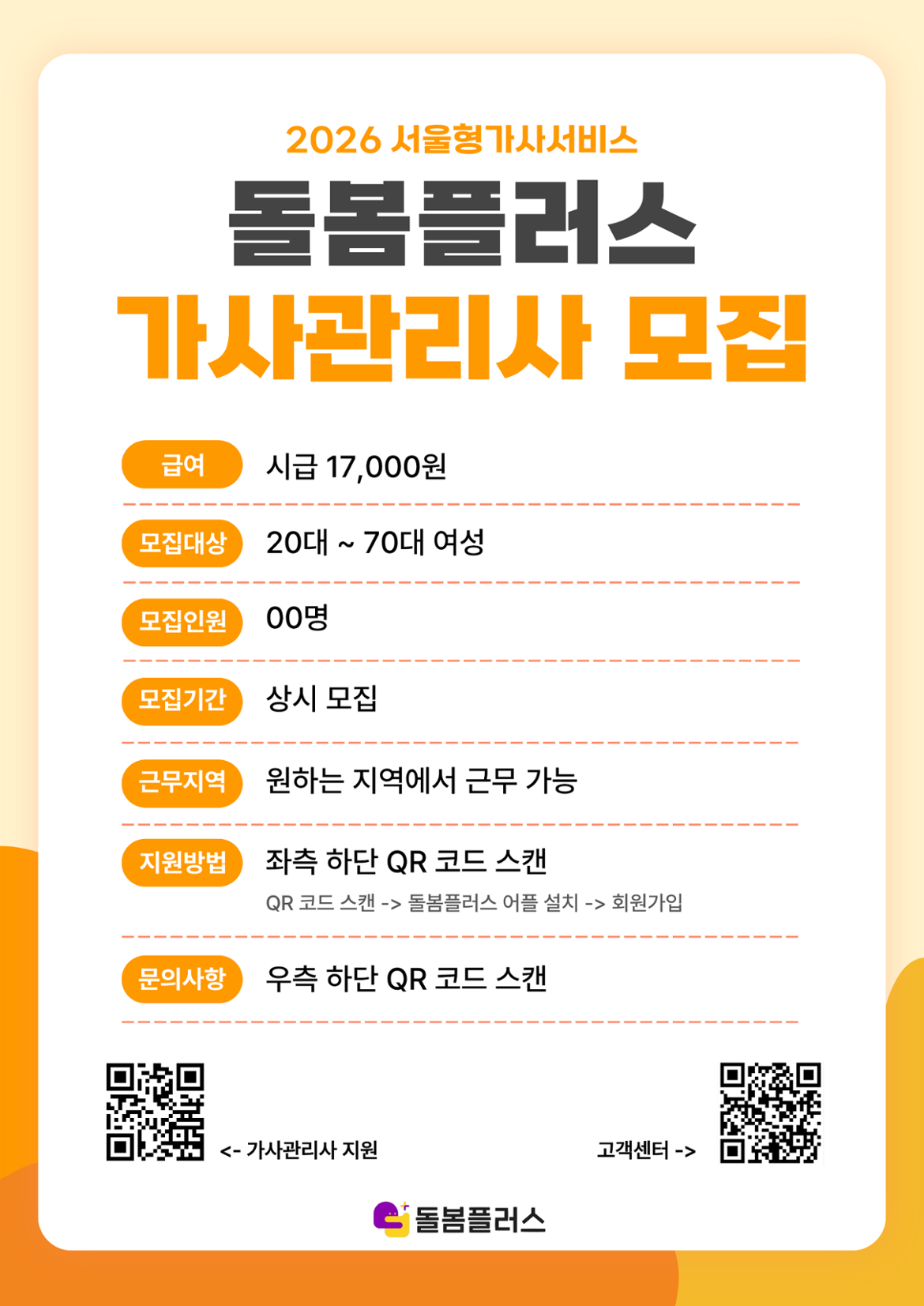 서울시 강북센터 | [채용정보] 2026년 서울형가사서비스 돌봄플러스 가사관리사 모집 (상시모집)