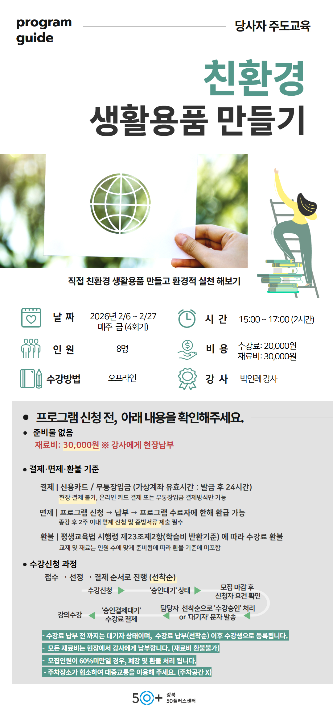 (2 회차) 2026.02.13(15:00 ~ 17:00) 2층-강의실 1 박인례 지구와 내몸을 지키는 천연탈모샴푸바 만들기 필기도구