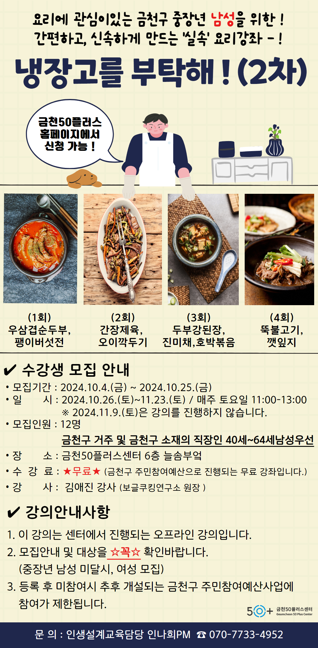 금천50플러스센터 금천구 중장년 남성 요리강좌 요리강좌