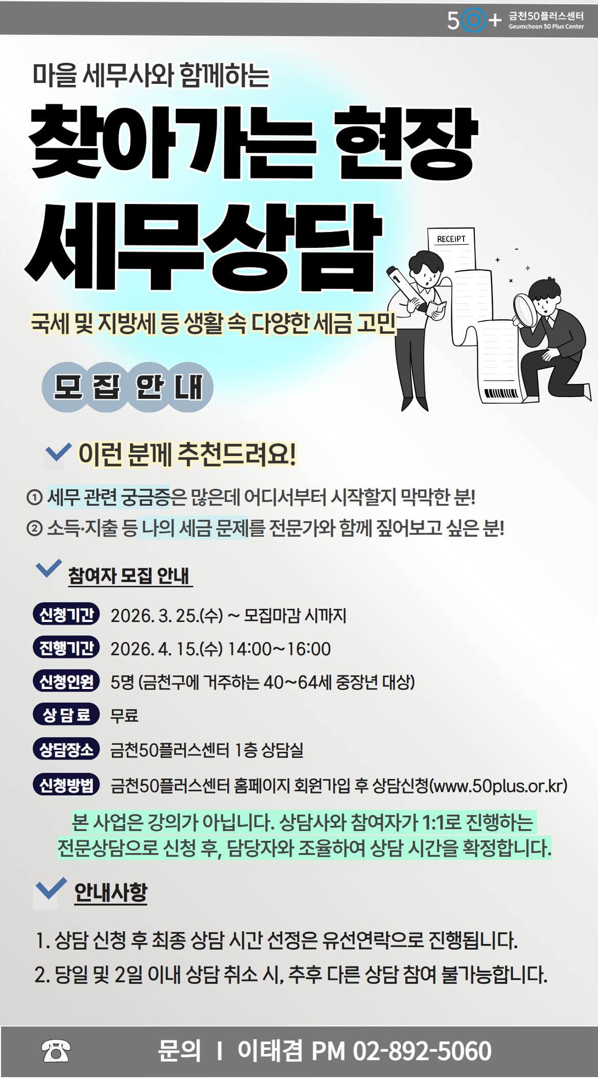 (1 회차) 2026.04.15(14:00 ~ 16:00) 1층 50+상담실 금천구청 세무관리과 마을세무사와 함께하는 세무상담(20분소요)