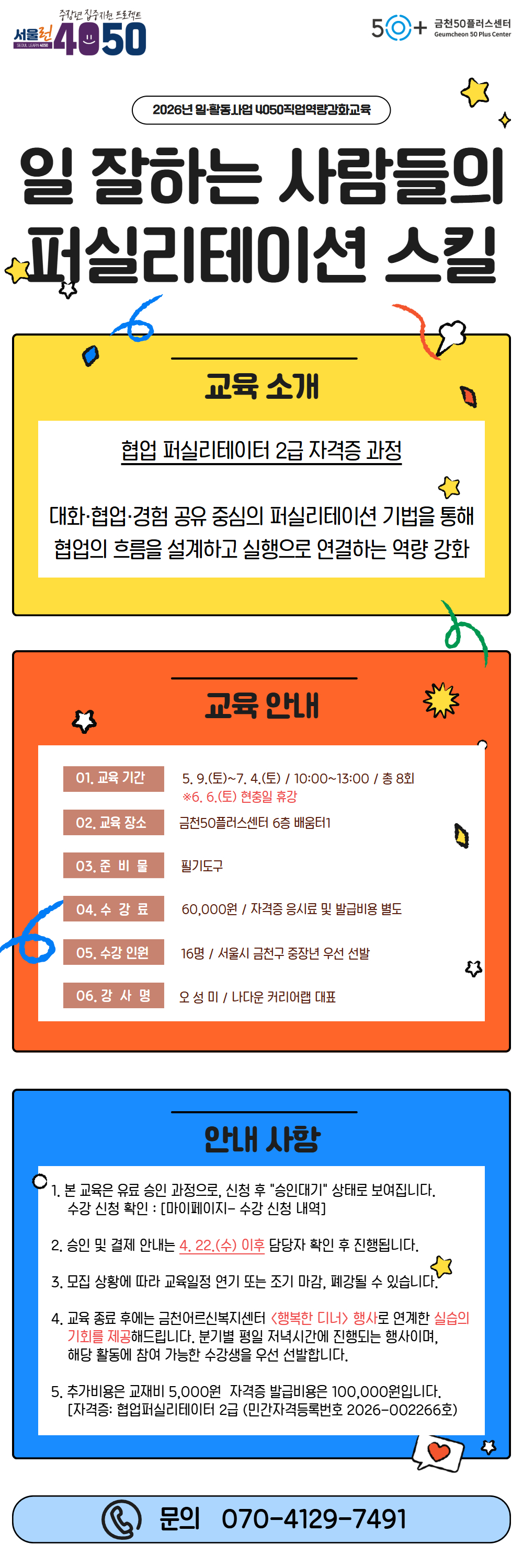 (1 회차) 2026.05.09(10:00 ~ 13:00) 6층 배움터1 오성미 [일 잘하는 사람들은 혼자 일하지 않는다:협업 퍼실리테이션]