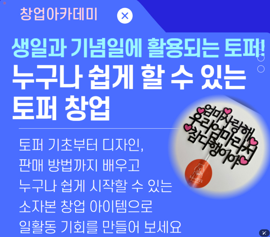 토퍼 제작의 기초부터 디자인, 판매 방법까지 배울 수 있어 소자본 창업 아이템으로 활용 가능한 실속 있는 과정입니다.