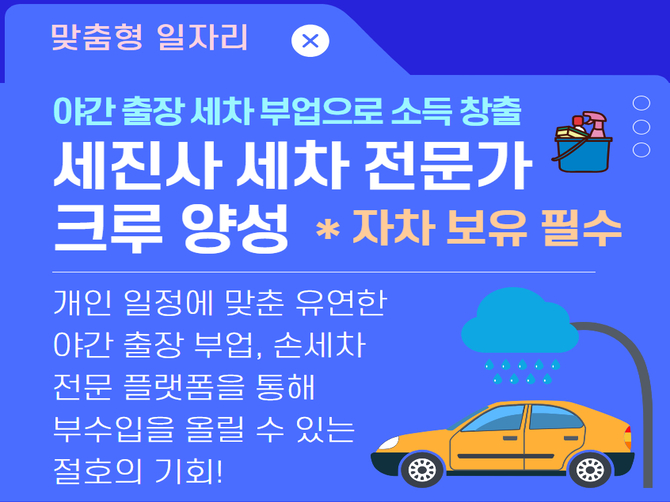 여러분에게 새로운 일자리 형태인 세진사 세차 전문 크루 과정 참여를 적극 추천합니다!
