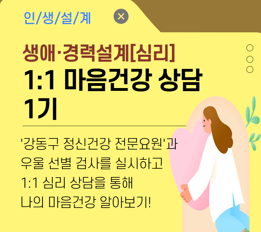 (1 회차) 2026.03.19(10:00 ~ 14:00) 강의실 403호 강동구 보건소 정신건강전문요원 ∙ 1:1 우울 선별검사 및 심리상담 진행(1인당 50분)