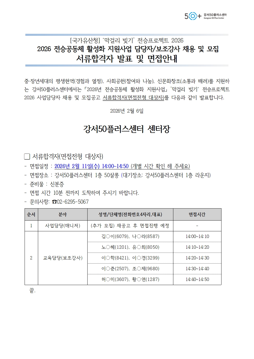 서울시 강서센터 | 2026 전승공동체 활성화 지원사업 담당자/보조강사 서류합격자 발표 및 면접안내