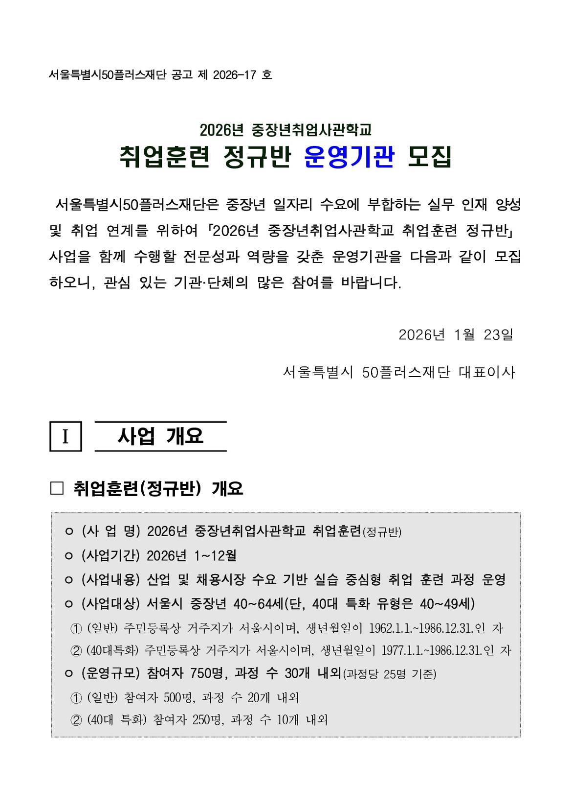 2026년 중장년취업사관학교 「취업훈련 정규반 운영기관」 통합 모집