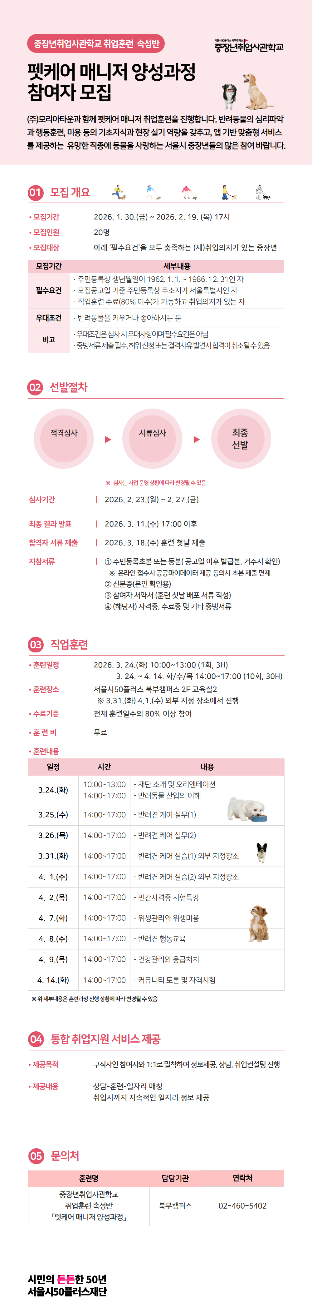 서울시50플러스재단 중장년 취업사관학교 펫케어 매니저 양성과정 참여자 모집공고마감 D-9