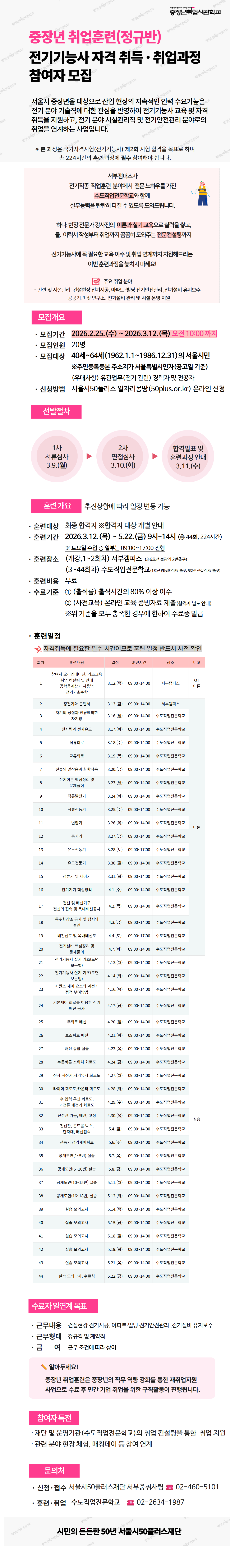 전기기능사 교육 및 자격 취득을 지원하고, 전기 분야 시설관리직 및 전기안전관리 분야로의 취업을 연계하는 사업입니다.