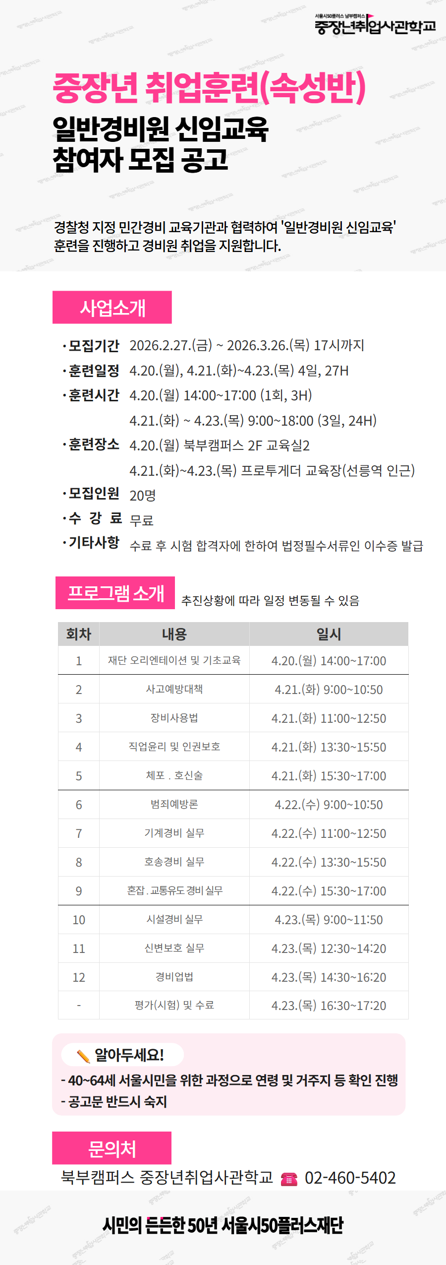 2026년 중장년취업사관학교 취업훈련 속성반「일반경비원 신임교육」참여자 모집 공고마감 D-22