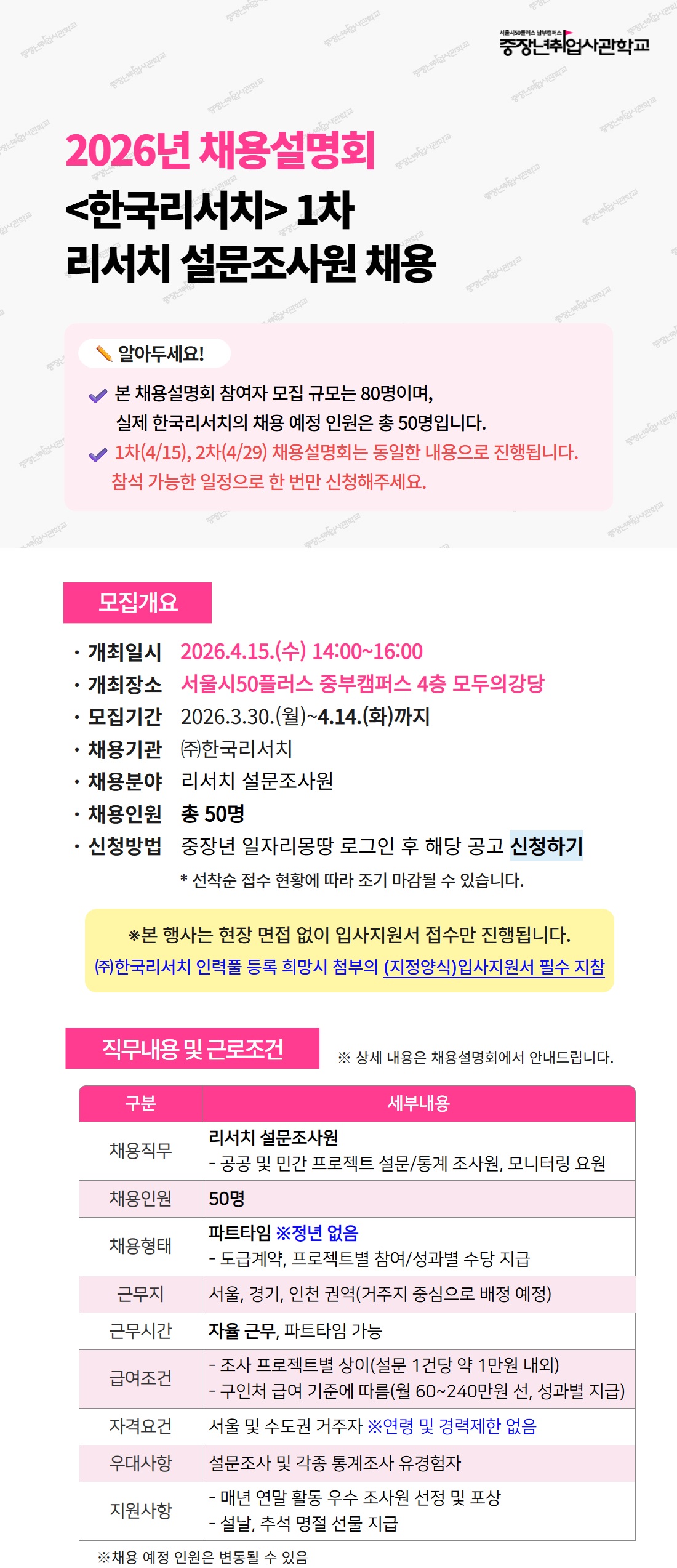 본 채용설명회 참여자 모집 규모는 80명이며, 실제 한국리서치의 채용 예정 인원은 총 50입니다.