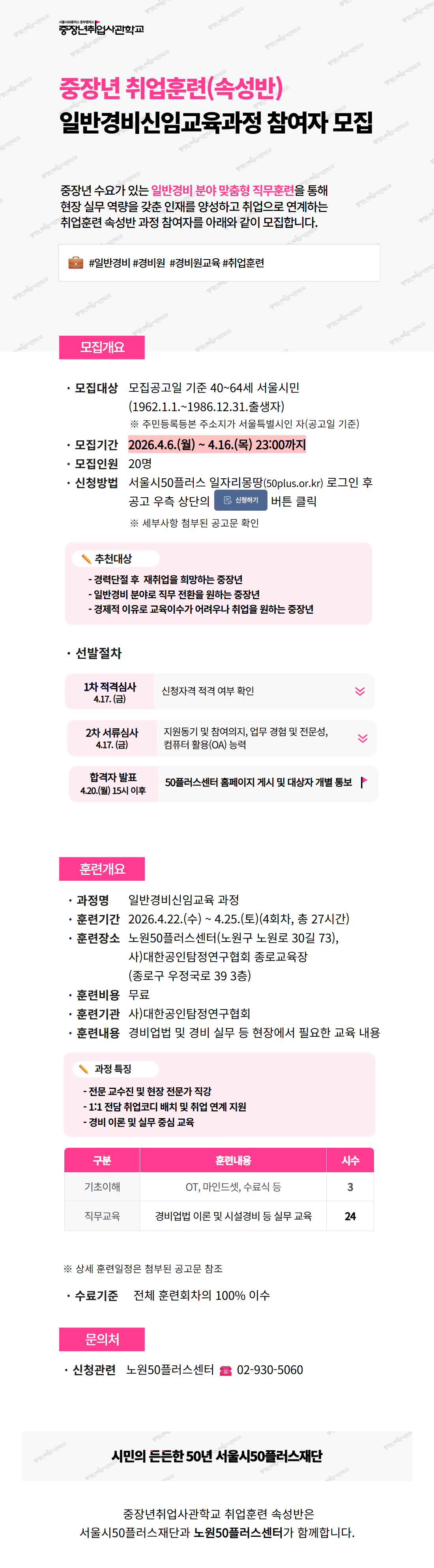 속성반 「일반경비원신임교육 과정」 참여자 모집 공고마감 D-7