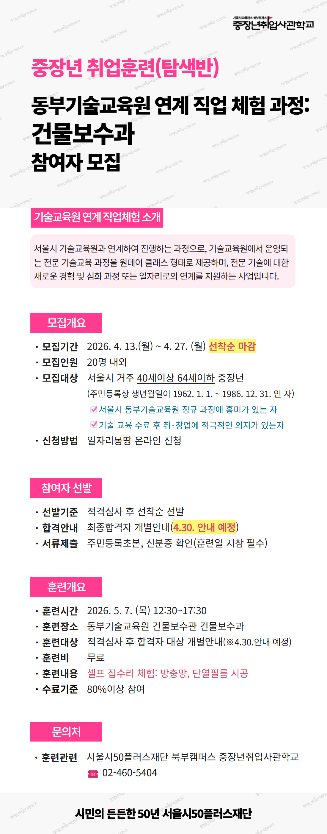 탐색반「동부기술교육원 연계: 건물보수과 직업체험 과정」 참여자 모집마감 D-1