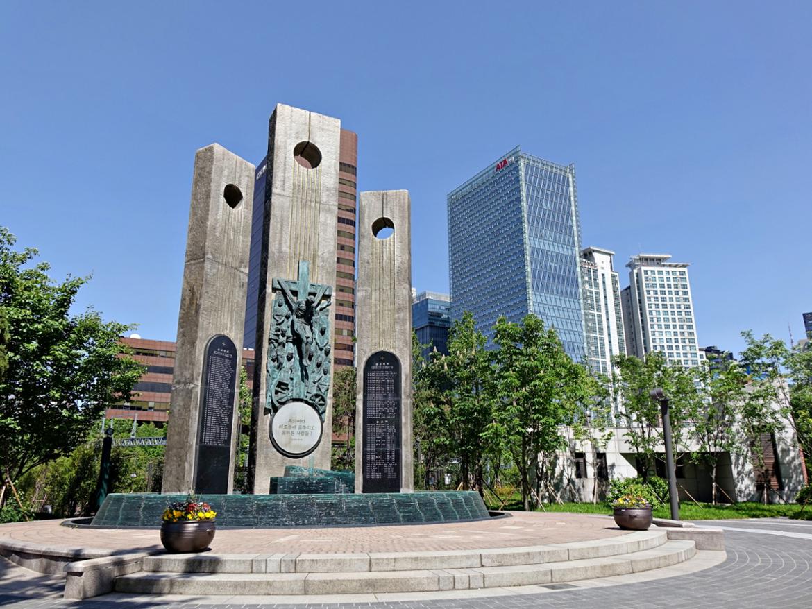공원은 지상과 지하 4층 건물로 조성되었는데 지상은 원래의 서소문 근린공원을 재조성했어요. 1984년 세워진 순교자 현양탑 앞으로 광장이 펼쳐지고 이제 조금씩 나무들이 제자리를 잡으며 자라고 있습니다.