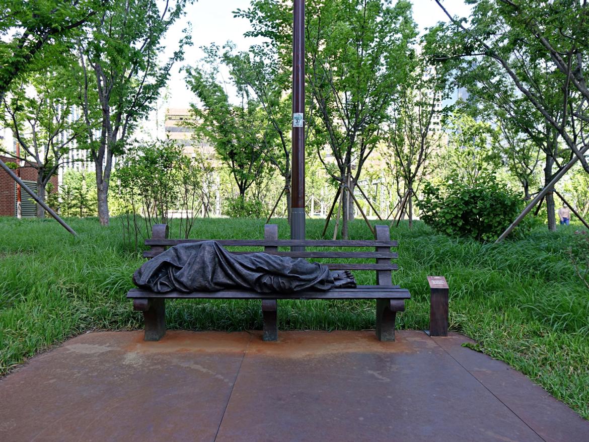 공원 한복판 벤치에 캐나다 작가 티모시 슈말츠가 제작한 ’노숙자 예수‘가 있다.