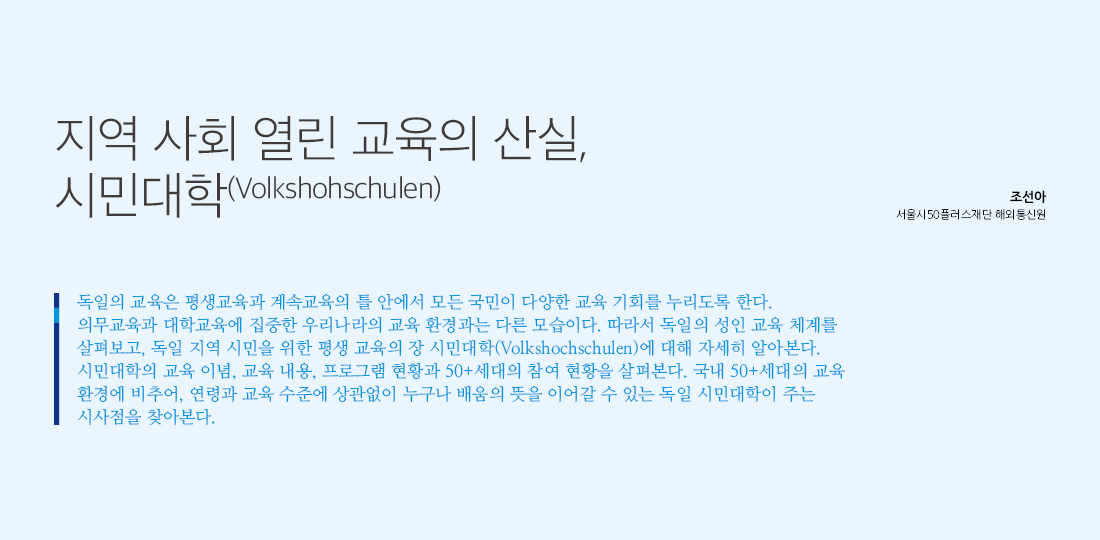 독일의 교육은 평생교육과 계속교육의 틀 안에서 모든 국민이 다양한 교육 기회를 누리도록 한다. 의무교육과 대학교육에 집중한 우리나라의 교육 환경과 비교되는 모습이다. 따라서 독일의 성인 교육 체계를 살펴보고, 독일 지역 시민을 위한 평생 교육의 장 시민대학(Volkshochschulen)에 대해 자세히 알아본다. 시민대학의 교육 이념, 교육 내용, 프로그램 현황과 50+세대의 참여 현황을 살펴본다. 국내 50+세대의 교육 환경에 비추어, 연령과 교육 수준에 상관없이 누구나 배움의 뜻을 이어갈 수 있는 독일 시민대학이 주는 시사점을 찾아본다.