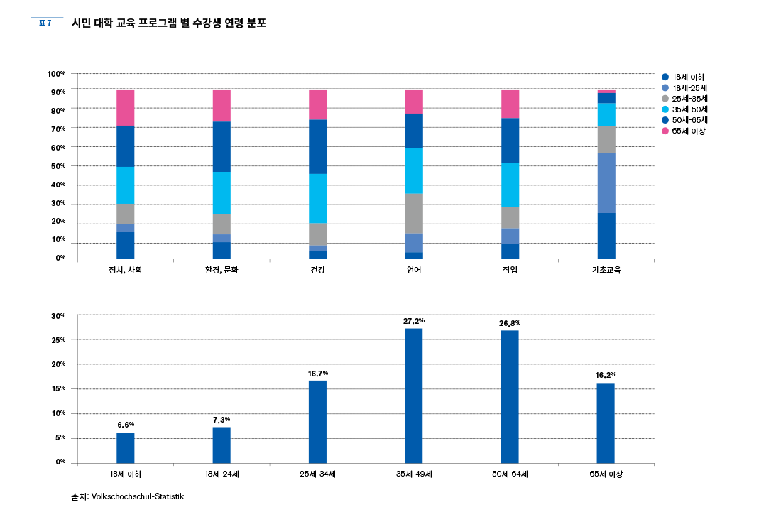 앞서 본 바와 같이 독일 전체의 시민 대학 수강생의 절반 가까이를 50세 이상의 성인 인구가 차지하고 있다. 점점 장년 이상의 성인 수강생이 늘어나는 추세는 지속적으로 배우지 않으면 따라 갈 수 없을 정도로 빠르게 진행되는 정보화와 산업 구조의 변화와 더불어 이루어진 지식과 정보의 폭발적 증가로 인하여 이전에 받은 교육 정도와 상관없이 배움을 이어나가야만 사회 생활에 적응해 나갈 수 있는 현대 사회의 특징이 반영된 것일 것이다. 특히 늘어난 여가 시간과 생활의 안정을 기반으로 생애에 걸친 배움의 기회를 누리고자 하는 요구가 과거의 어느 시대보다 높다고 할 수 있다. 더 이상 교육을 받지 않아도 될 것 같이 여겨지던 성인 세대조차 새로운 지식에 대한 계속되는 학습을 요구받고 있다. 그런 의미에서 연령에 구애 받지 않고 누구에게나 열린 교육을 실천하는 시민대학이 독일 사회 속에서 가지는 의의는 매우 크다.