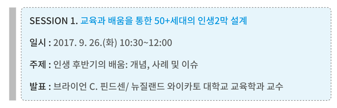 두 번째, 후반기의 배움은 개인적 만족을 위해서 필요하기도 하다. 배움 그 자체로도 충분히 가치 있는 일이라는 생각을 공유하고 개인적인 성장을 목표로 한다. 아이디어가 풍부하고 회복력이 강한 중고령자가 되기 위한 배움을 계속해야 한다.