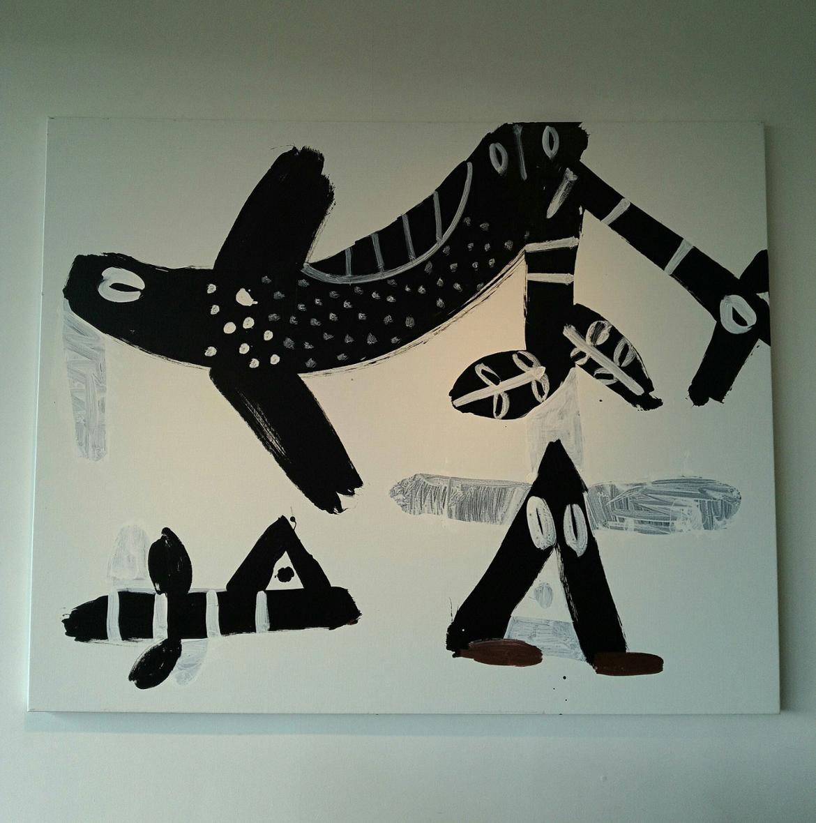 제목 미상, 작가의 작품인 큰 걸음, 나무가 된 사슴 등을 한 캔버스에 그려놓았다.