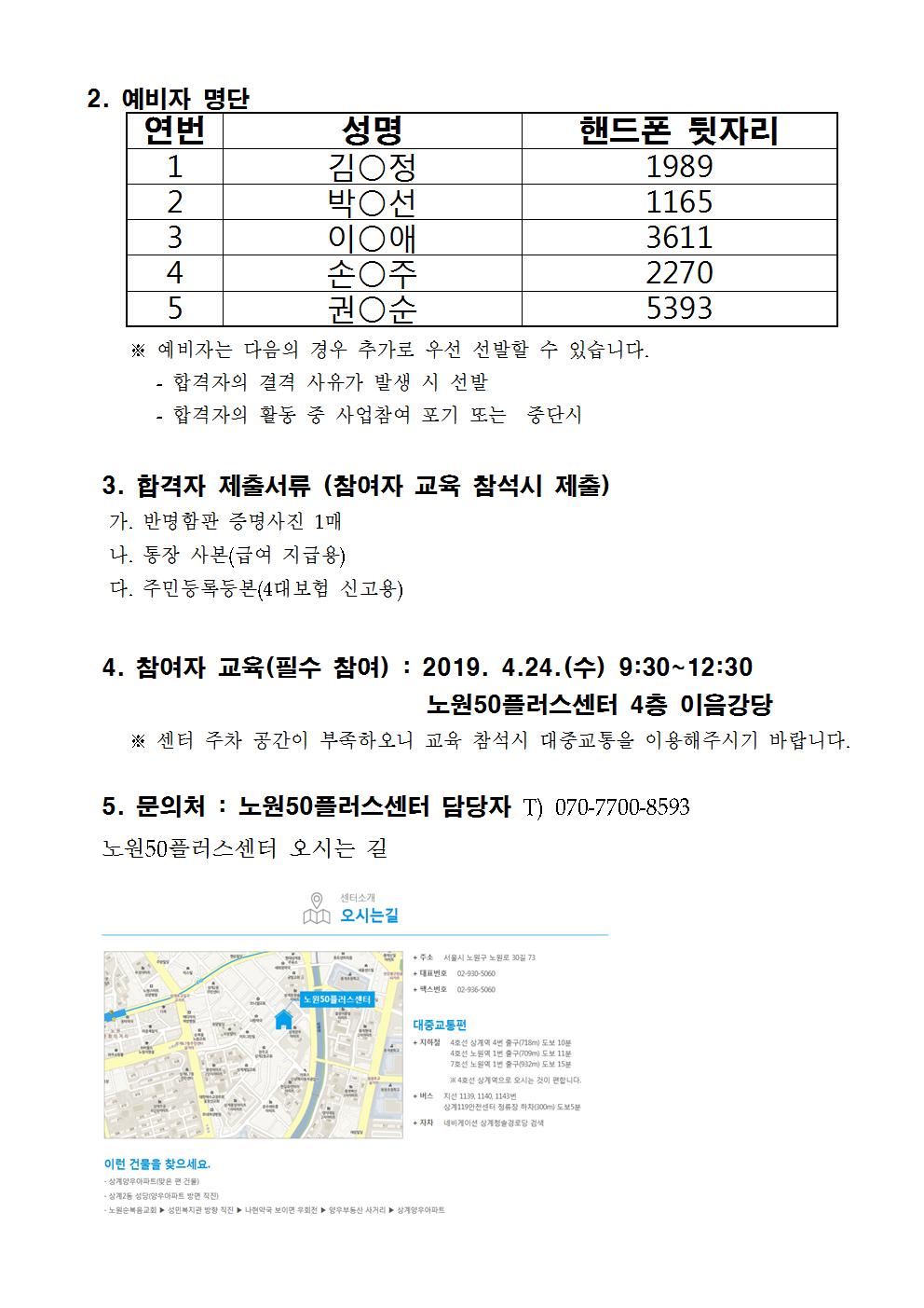 노원50플러스센터 (우 01697 )서울시 노원구 노원로 30길 73 사업자등록번호 : 305-82-86739 대표자 : 장부경