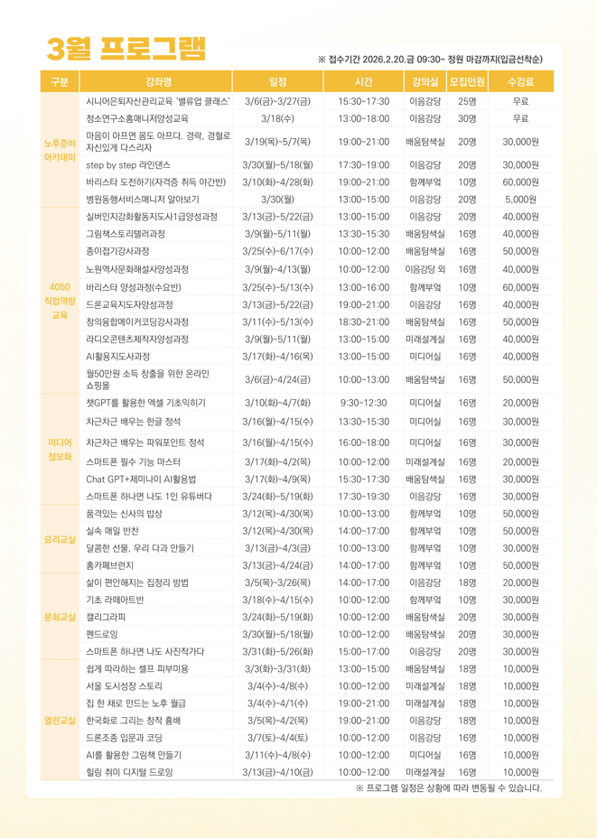 기존 배포된 전단지 내용과 변경된 강좌가 있을 수 있으니 수강 신청 시 확인 바랍니다.