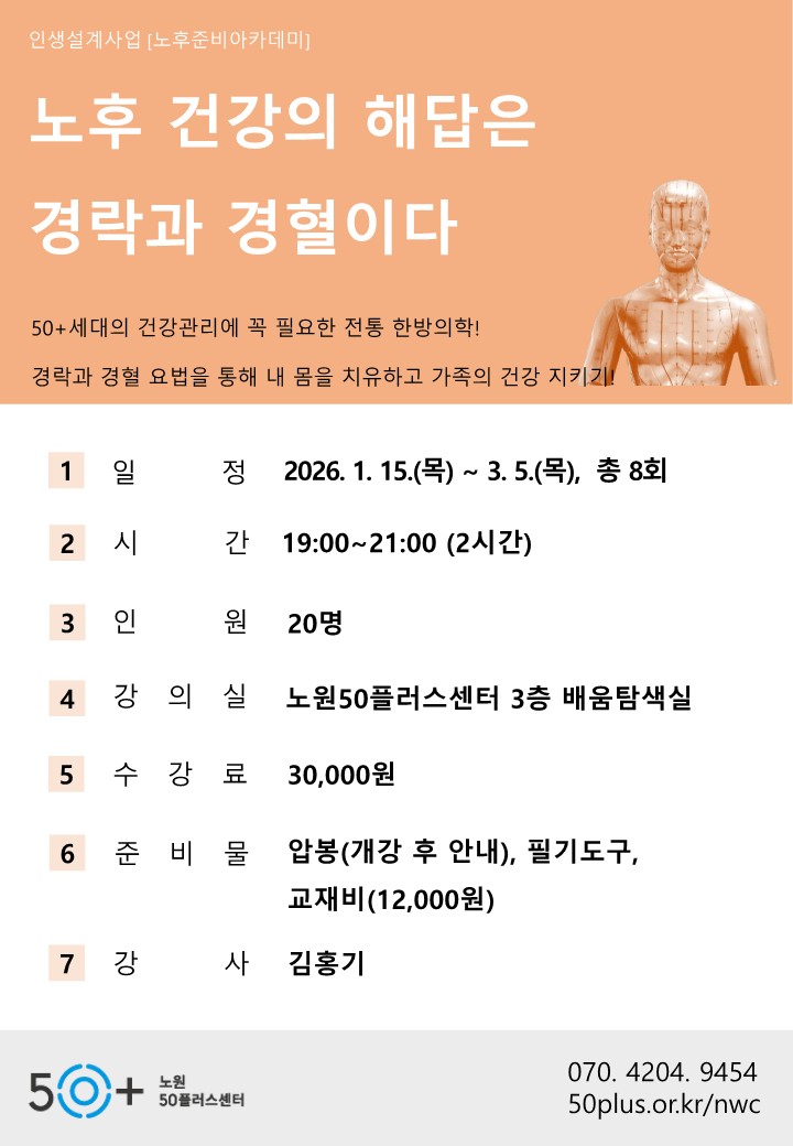 (1 회차) 2026.01.15(19:00 ~ 21:00) 배움탐색실(3F) 김홍기 자연치유의 경락과 경혈
