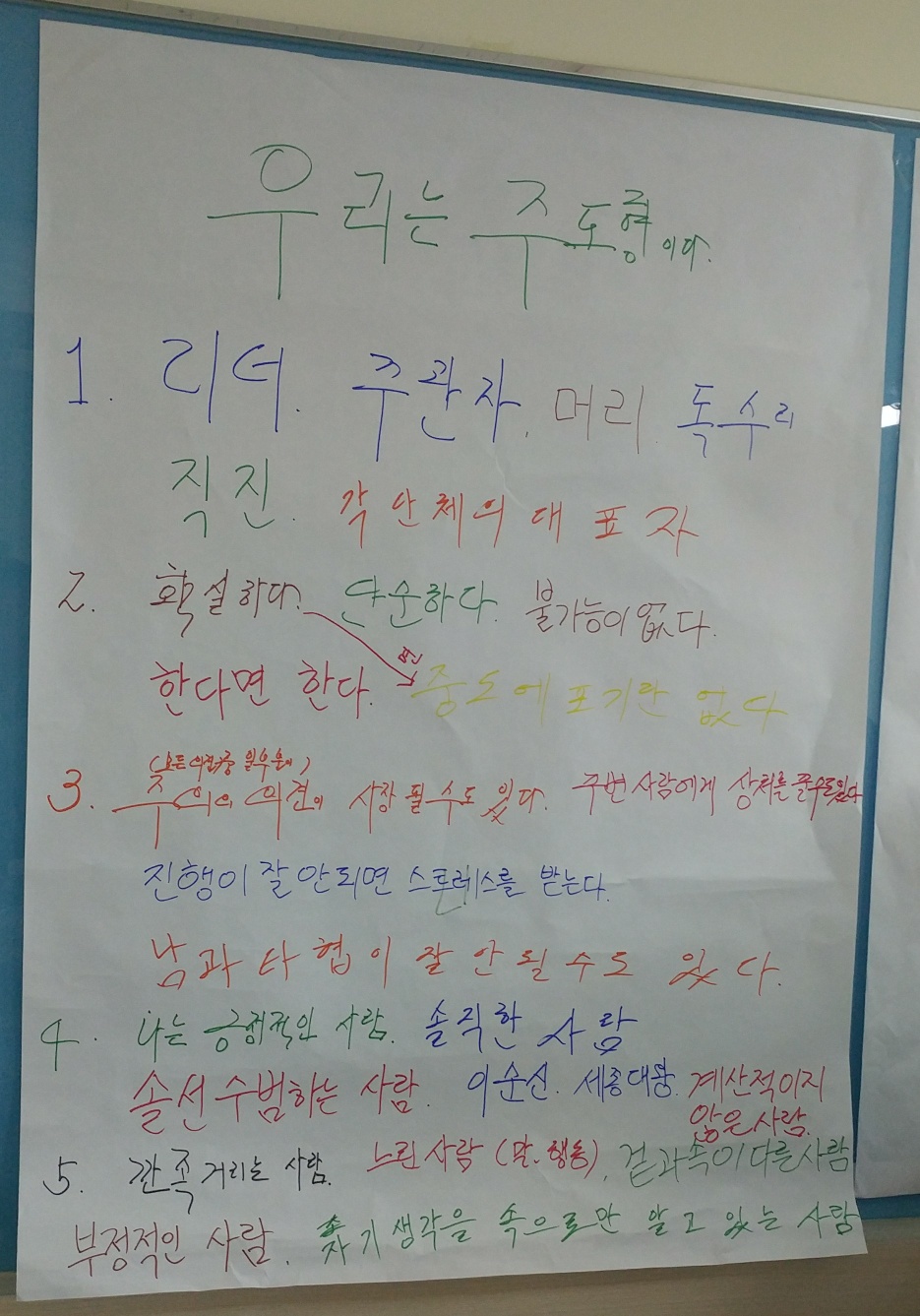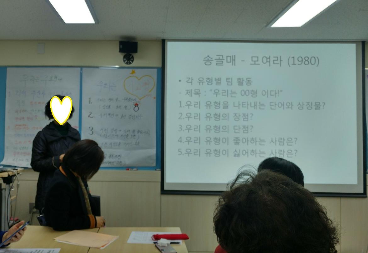 팀 대표들의 발표 시간. 임의로 대표를 뽑았음에도 불구하고 자신들의 성격을 더 정확히 파악해서인지 전문 강사 뺨칠 정도로 실감나게 설명한다. 내 남편, 내 아내, 내 자녀는 어떤 유형인가? 다른 유형의 특성에 귀 기울이게 된다.