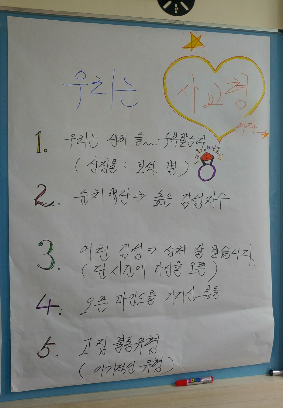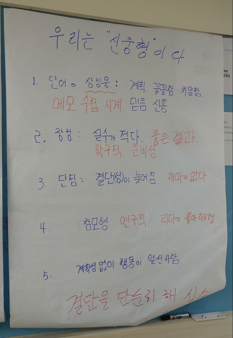 같은 유형의 사람들끼리 자리 배치. 팀 활동 시간. 여기저기서 “어머어머, 맞아요.” “맞아맞아 어쩜! 나랑 넘 똑같네.” 와글와글~ 웅성웅성~ 수강생들의 탄성이 터져 나온다. 팀 별 공감이 뛰어난 것 같다. 역시 사교형 팀이 제일 시끄럽다^^ 아~ 정말 성격은 천성인가보다~